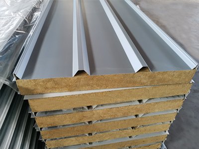 彩鋼巖棉板其上下表面采用鍍鋅彩色鋼板或鍍鋁鋅彩色鋼板,厚度為0.4-0.8mm。通過(guò)自動(dòng)化連續(xù)成型機(jī),經(jīng)壓型后用高強(qiáng)粘合劑粘合而成。巖棉塊交錯(cuò)鋪設(shè),其纖維走向垂直于彩鋼巖棉夾芯板的上下表面,并緊密相接充實(shí)了彩鋼巖棉板的整個(gè)縱橫截面。巖棉塊之間和域名與上、下層鋼板之間通過(guò)高強(qiáng)度發(fā)泡劑粘接復(fù)合而成。彩鋼巖棉板有很強(qiáng)的剛度,具有防火、保溫、隔音等性能。